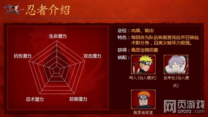 每回合为队伍恢复查克拉并召唤仙术影分身,且40点查克拉的奥义拥有极其可观的伤害,适合与大部分忍者进行搭配。