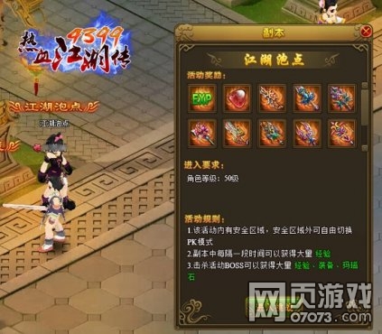 在《4399热血江湖传》中,等级达到50级即可参加江湖泡点副本。每天会有共两个小时的江湖泡点副本,分别在上午的10:30到11:30和下午的16:30到17:30,每隔一小段时间就会获得大量经验。