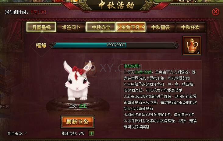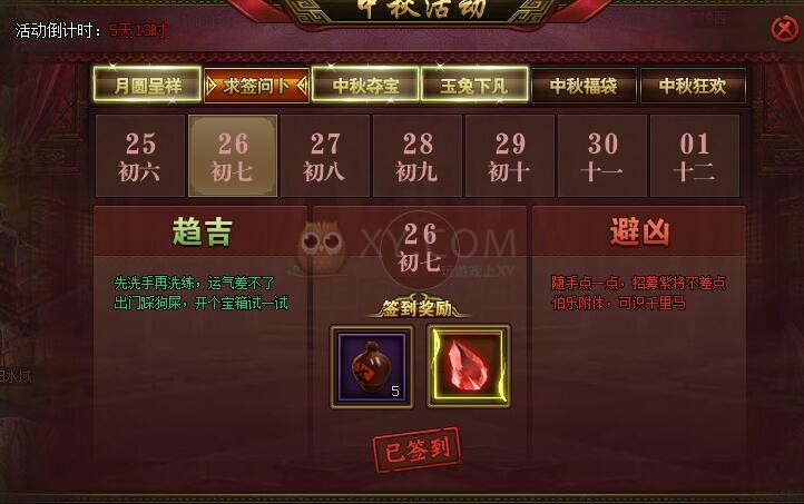 中秋活动分别是月圆呈祥、求签问卜、中秋夺宝、玉兔下凡、中秋福袋和中秋狂欢。