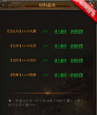 除了等级限制,每次进入材料副本需要消耗灭魔令。在线每半个小时自动获得4个灭魔令,不过如果你很着急的话,不妨去商城转转。