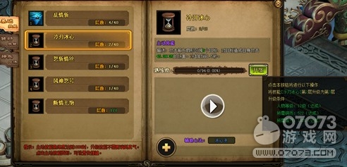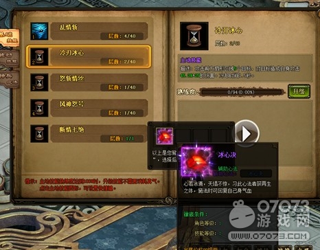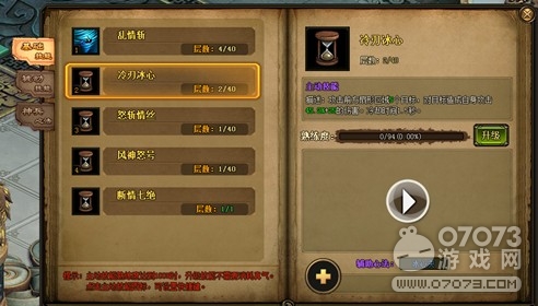 点击技能界面的升级按钮,就可以升级技能,升级技能需要达到一定的等级,以及消耗一定的真气和银两。