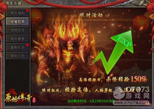《原始传奇》电脑版游戏中随着等级的不断提升,升级的难度也在不停的升高,但是不用怕!官方为庆祝《原始传奇》电脑版周年庆,限时开放经验狂欢活动!活动期间杀怪经验150%,让你在刷刷刷的同时经验蹭蹭蹭地往上涨,让你飞速提升等级的同时体验不一样的玩法!还等什么?快来参加经验狂欢活动呀!