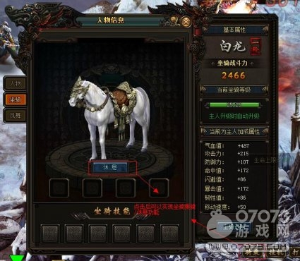 人物升级时坐骑也自动升级,坐骑等级越高加成属性越多。