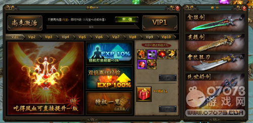 充值1元宝=1vip成长值,当前游戏版本最高vip10,升级vip等级将会获得更多的游戏特权和特殊宝刀宝剑和各种豪礼。
