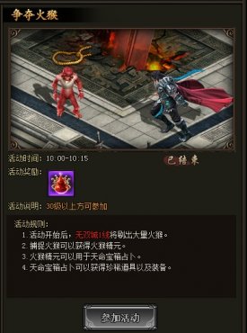 争夺火猴活动中获得的火猴精血可用于天命抽奖,获得珍稀的商城道具。