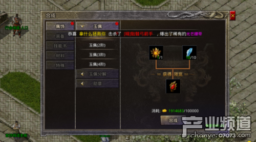 我们可以点开右侧合成图标可以看到,里面分为5个类别:佩饰、装备、技能书、材料和特殊。这也分别对应了不同的提升方向。其中佩饰一栏主要是针对我们的玉佩和勋章,不仅能用材料和金币升级,还可以分解。而装备则是从45级的装备开始,可以依次网上合成为50级、1转装备等。