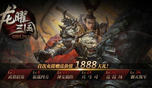 《龙曜三国》充值比例1:1000,上线送V5,58888元宝,888万银币,首冲礼包(背包内)