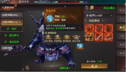 (1).稀有-觉醒神殿boss:转生等级达到4转开启4层,4层开始有概率掉落金身材料--青龙之魂;