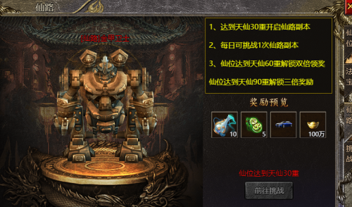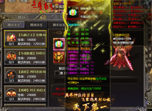 当仙位达到一定等级后,可以进入仙位挑战地图内刷怪,获取法宝装备提升实力。