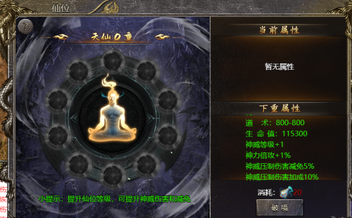 提升仙位等阶时会获得神力倍攻的能力,提升自身攻击加成、防御加成、生命加成属性,提升仙位等阶时,还会额外提升神威等级,但是,额外提升的神位等级仅为等级变化,不具备神威实际属性提升,仙位位阶越高,神力倍攻、额外神威等级提升也越高。