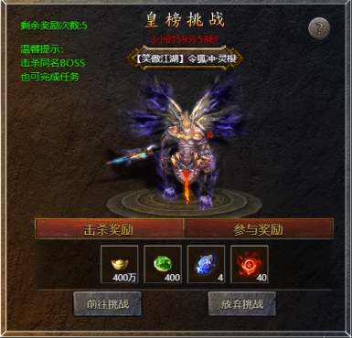 皇榜令牌任务任务需要在4小时内完成,否则,任务将会自动消失。玩家获得归属并击杀BOSS,可获得击杀奖励。在副本内攻击怪物,怪物归属为他人,且被他人击杀,可获得参与奖励,掉线或退出副本,参与奖不作数。每日击杀奖励和参与奖励共用次数为5次。击杀奖励和参与奖励主要有大量绑定元宝、无量晶、命运石、特戒灵粹,击杀奖励的数量会多一些,参与奖励会少一点。