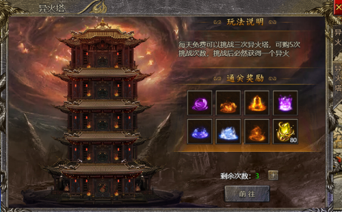 异火塔每天可以免费挑战3次,还可购买5次挑战次数,单日合计可以挑战8次,挑战后可以获得异火的升级材料,也必然可以获得1个异火。