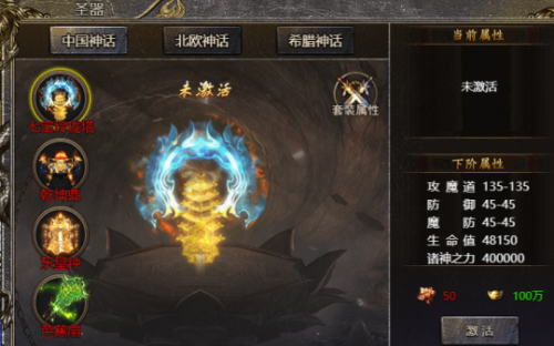 圣器里有中国神话、北欧神话、希腊神话3个小系统,每个小系统里有4个属于每个神话系统的特有武器。集齐12个圣器可以激活套装属性,获得攻击、魔法、道术、防御、魔防、生命值、吸血的属性加成。