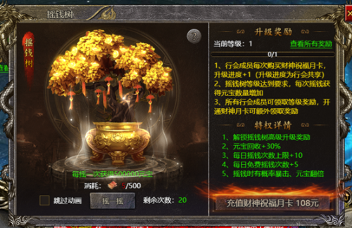 加入行会之后,我们就可以查看到行会的相关信息以及其他玩家的信息。同时还能参与不同的行会活动。行会摇钱树,每摇一次可获得500000元宝,元宝拿到手软!摇钱树还会升级,级别越高,每次获得的元宝数量增加,并且所有行会成员均可领取等级奖励,还不快来~