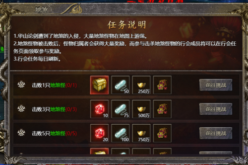 行会还有行会任务,完成行会任务即可领取豪华大礼~华山论剑遭遇了地煞入侵,我们的任务则是消灭这些地煞怪物,地煞怪物被击败后参与者和击杀者会获得大量奖励,不仅有绝世装备,还有天蚕丝,海量元宝等道具等你来拿!