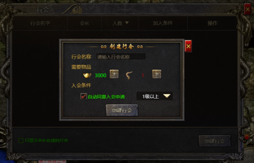 如何创建行会?在完成主线任务后,就会出现加入或创建行会的支线任务,我们可以选择加入一个行会或者创建一个行会。加入行会只需看自己是否符合该行会的加入条件,符合条件申请就可加入。若需要创建行会则需要3000元宝和一个行会号角才能创建~行会号角需要在商城内花费1000灵符购买。