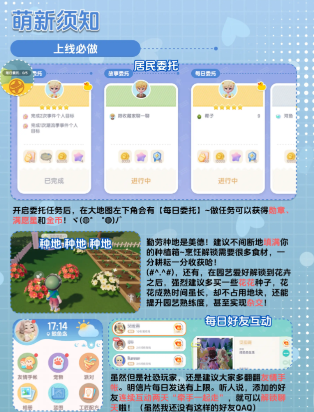 ② 上线必做篇:除了坚持清主线日常,还应该做——每日任务、收菜种地、跟好友打招呼,还有写在最后的每日刷新的萤石和珍稀木材、限时商店也要记得买买买——这些都是建议大家每天上线一定一定要做的事情,缺掉的话,会少很多材料和必要的图纸、家具装饰奖励之类的。(但其实心动小镇做得并没有那么复杂,任务也好、攒钱也好,更多地是休闲,清任务很快,大多数的时间都是自己用来建造和搭配啦。)