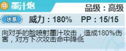 墨汁炮;向对手的脸喷射墨汁攻击,造成180%伤害,对方下次攻击命中降低。高级水系技能。