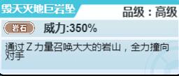 毁天灭地巨岩坠:通过Z力量召唤大大的岩山,全力撞向对手。威力350%的高级岩石系技能。