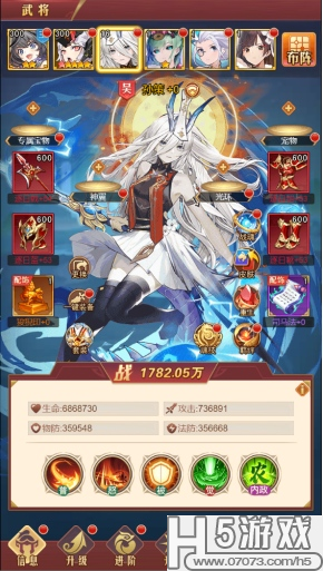 除蓝色武将外,其他品质的武将可以通过武将培养系统进行品质提升。武将可以通过招募,关卡,活动获得。武将通过在主界面进入。玩家可以进行武将上阵,玩家共可以上阵6个角色,其中1个主角,5个武将。