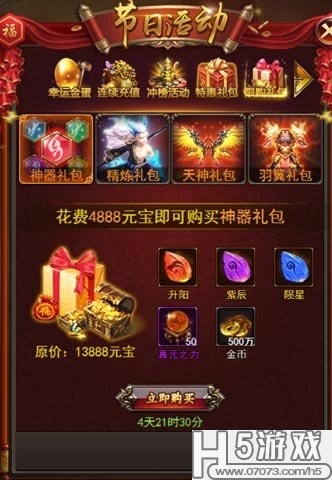 神器礼包(4888元宝):升阳*1 紫辰*1 陨星*1 真元之力*50 金币*500万