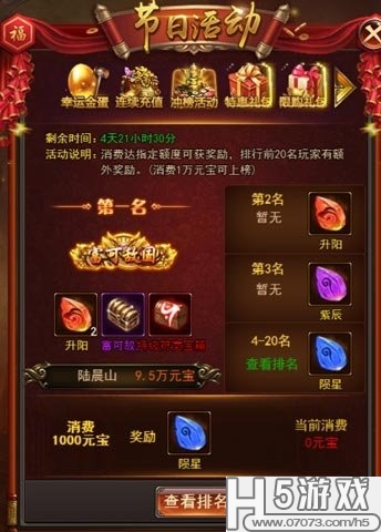 活动期间参与排行榜可以获得丰厚的奖励,消费元宝达到1万即可上榜争夺排行榜名次,排名越高奖励越多哦