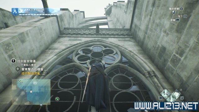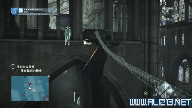 然后会发现半弧走廊东北尽头有一个窗户,窗户上连接着一条绳索,踩上绳索进入到教堂内,去到对面二层边缘时,快速悬吊在二层的边缘,避免二层走廊上的敌人发现亞诺。