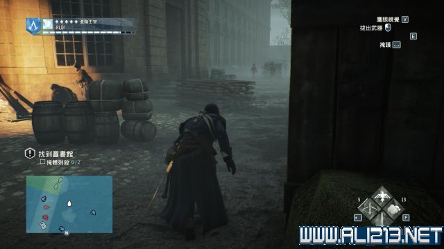 在一层的骑楼走廊(西面)内不会遇到敌人,然后马上溜进右侧的图书馆内(哪怕亞诺此时进入到图书馆内,游戏也不会弹出提示),并且贴在书柜后。