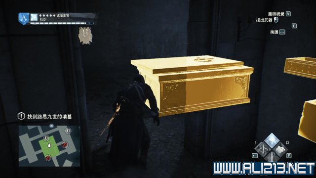 进入到一个摆放石棺的房间,使用鹰眼可以看清楚这些石棺的情况,用鹰眼查看发现有两个石棺依然是盖上的,那么前往北面,那个较大的石棺上有一个十字架,那就是路易九世的石棺。