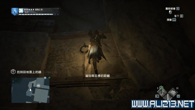 step11.接着来到阴暗的塔内,沿着右侧墙体上的木梁等攀附物跳到北面的窟窿前。