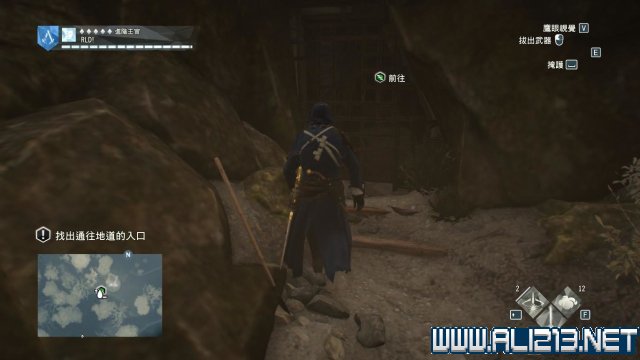 step2.先利用右侧的木架台去到南面的山洞前,这里有一名入侵者在扫地,先将其暗杀掉。