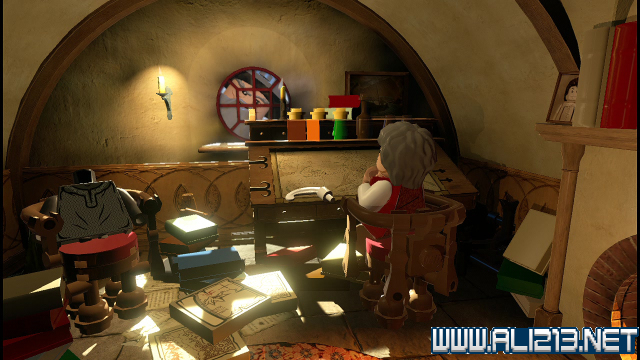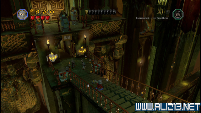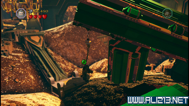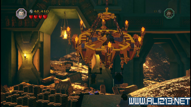 step24.到达对岸后,沿着小路往上走,看见顶部的吊灯后,让索林、柏林分别跳高抓住吊打两侧的杆子,让吊灯倾侧,此时在吊灯上的Thror就会掉到地面上,而阿肯宝石亦掉入茫茫的金库当中。