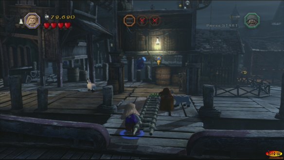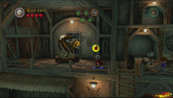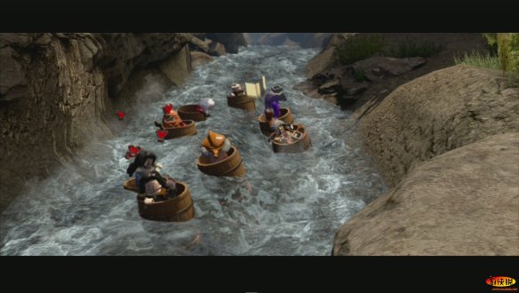 然后他们就全数被抓,而奥克斯也潜入了这个城镇。矮人们受到了优待,获准通过这里前往孤山。而另一边一个矮人中毒必须及时抢救,但是草药却被一只猪抢走了。好吧!有三个栅栏,必须全部打开,第一个栅栏,道具在船上,砸完后拼搭一把梯子。可以在二层推动开关过去。