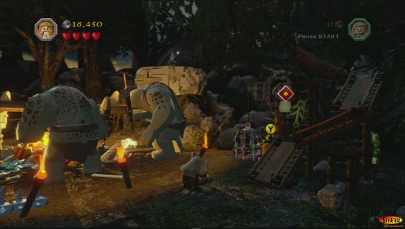 这一关还是简单的,不要朝着奥克斯的人潮就去了,只要在中央的空地,防止一下奥克斯就可以了,一直到傲人士兵打开前方的道路。会有巨型的奥克斯出现,这种奥克斯需要两个矮人合体才能打败,打败后用链剑拉断开关,使其倒塌就可以了,这样的一个建筑物里,有四个奥克斯组成,在顶上有两个弓箭手,下面也会埋伏奥克斯,建议看到就灭掉,