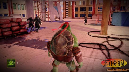 六 爬下大楼几百紫龙帮的人之后发现有几个跟剧情里一样的机器人来了,有枪,但是跟紫龙帮的人不是一伙的,这里紫龙帮的人会优先攻击机器人,再来打忍者龟。(貌似)
