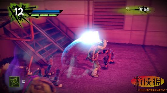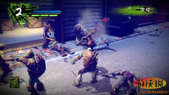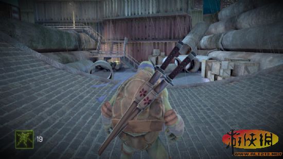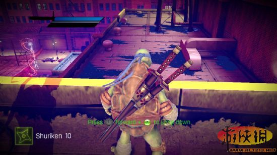 二 到了楼顶之后出门,正前方有一个忍者,在左边有一块披萨,解决忍者之后跳下房顶,会看见背对玩家的两个忍者,解决掉所有的忍者从左边翻下去,还有不少人,清场之后从右边跳到对面阳台,有一块披萨可以捡打败五名看门的忍者后进入仓库,里面有一罐功能饮料和一块披萨可以捡。之后来到一个阳台,在铁架上有两个戴斗笠的精英忍者。难打还很多,经常用一种攻击方式会被他躲避之后反击,最好是武器攻击与踢腿结合,而且斗笠的血量比较厚,还会叫小弟,很麻烦。全部清除之后爬上楼梯(原先斗笠站的地方)。