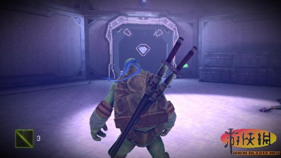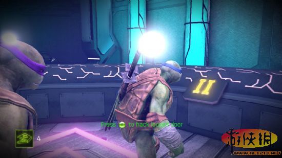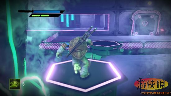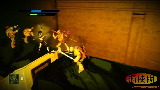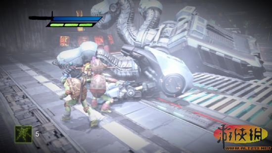 五 进门后触发剧情,打开桥上的电子锁之后上桥破坏四个培养炉,之后又大批大批机器人涌出,全部消灭。下了升降梯之后也是同样的步骤,这里机器人不会很多,在升降梯另一端有披萨和镖,拿去后通过升降梯来到另一边,下了升降梯就是一场硬仗,(除了玩家控制的乌龟,其他乌龟貌似会bug- -,就站着不动)打完之后老步骤(锁在桥头)。之后从下图处跳过去。