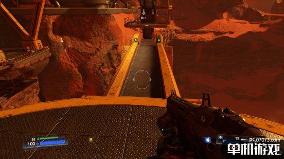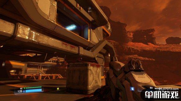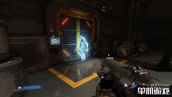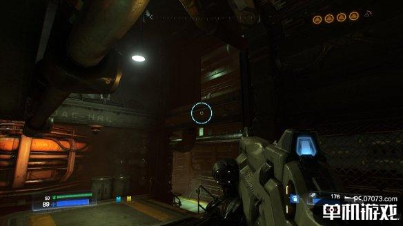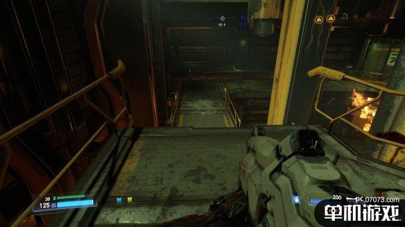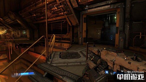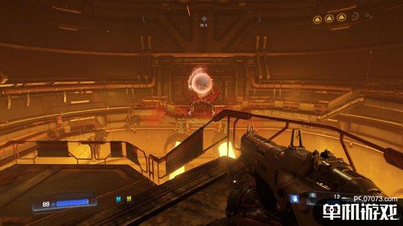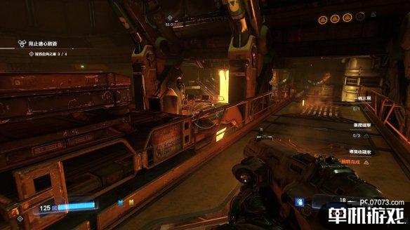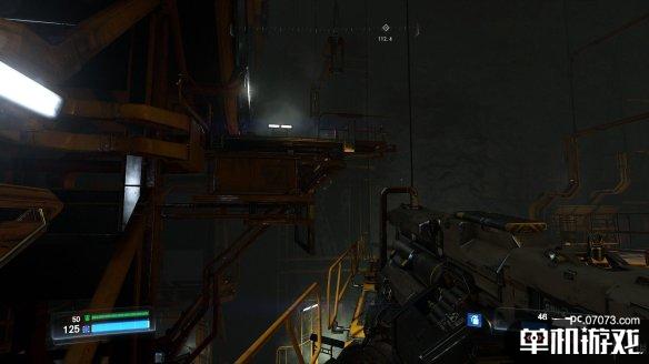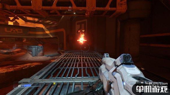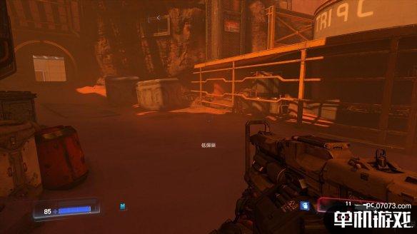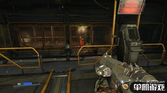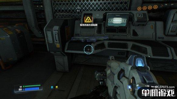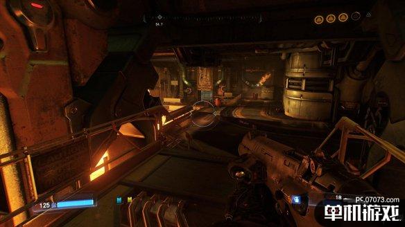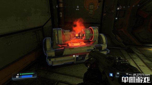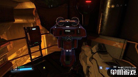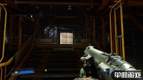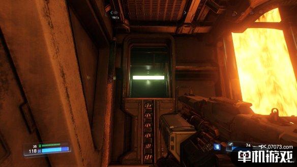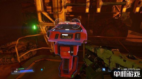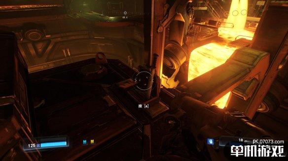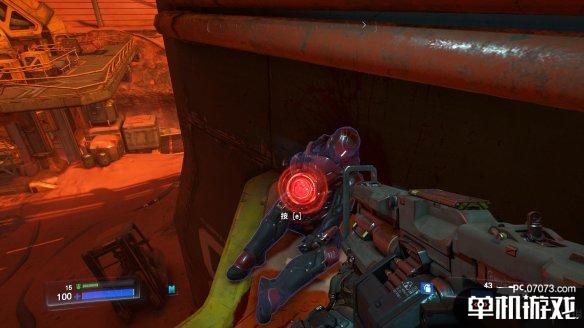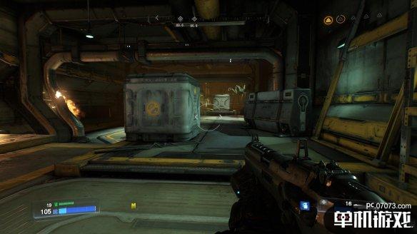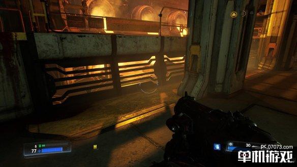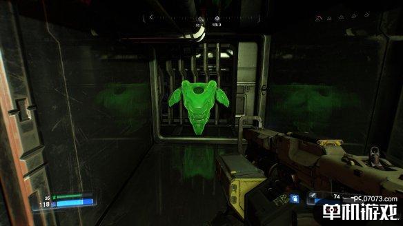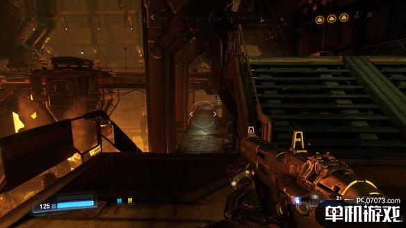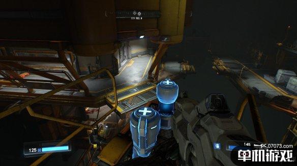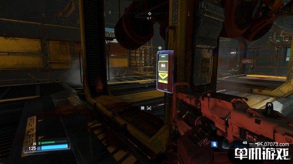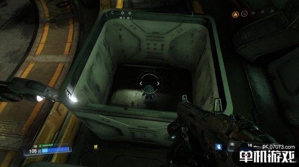 完成后往右侧的楼梯上去,那里是一扇需要黄色钥匙的们,由于得到了钥匙直接进入(这里会爬上来一只地狱骑士Ⅰ,请小心)。进去后会看到右侧的集装箱有机械臂在工作,那里三个集装箱中间的一个是空的,跳上去,在里面能发现秘密(4/6),一个电浆步枪模型。