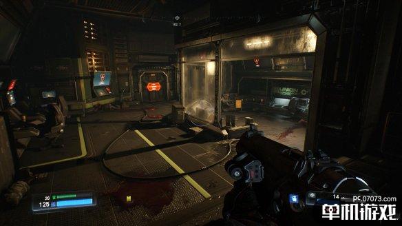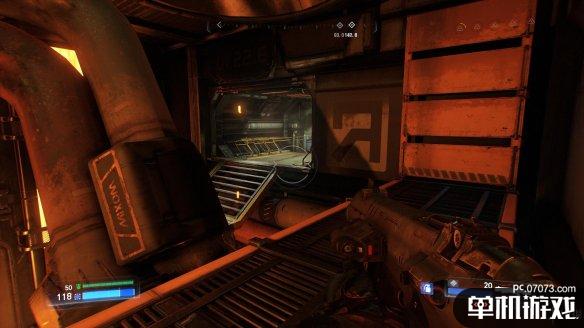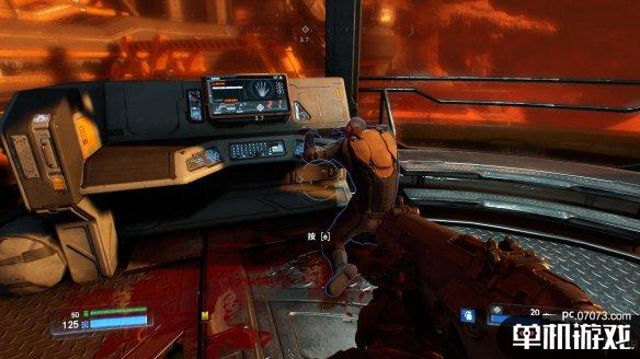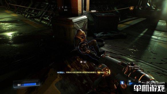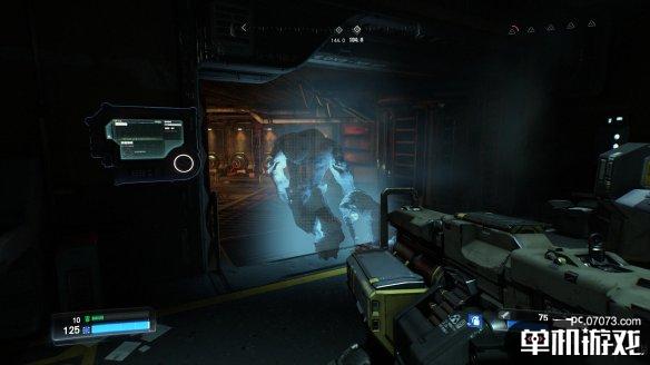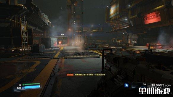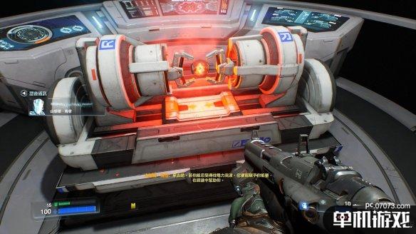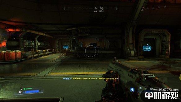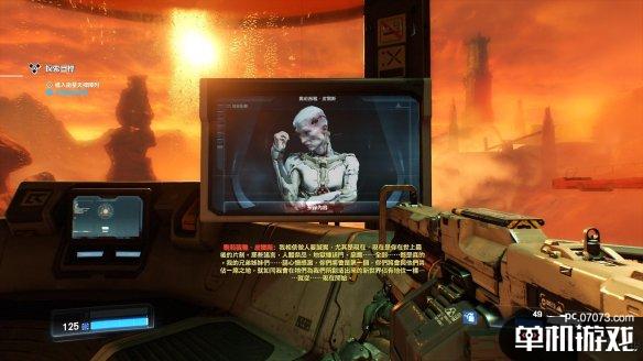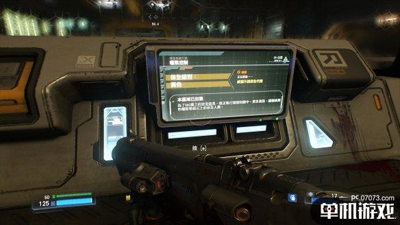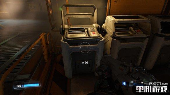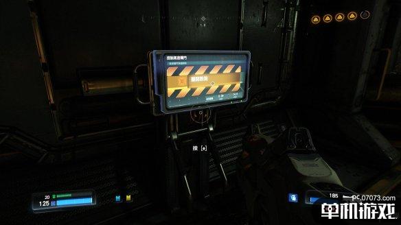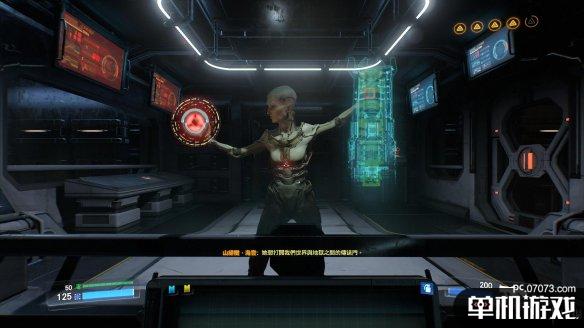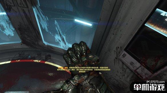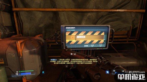 上面能看到一个UAC发言人的虚拟影像,洗脑般的吹嘘UAC的功绩以及疯狂的压榨人员的工作时间。我们只需从里面房间里的控制气密阀门的开关上点击离开设施,即可完成任务。