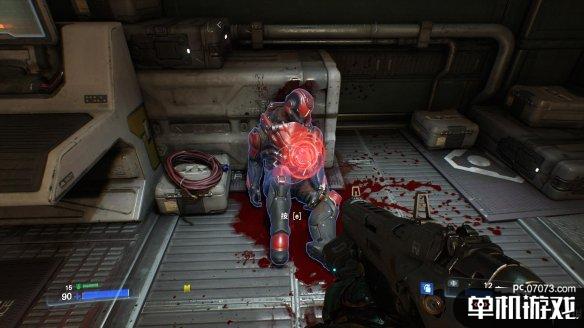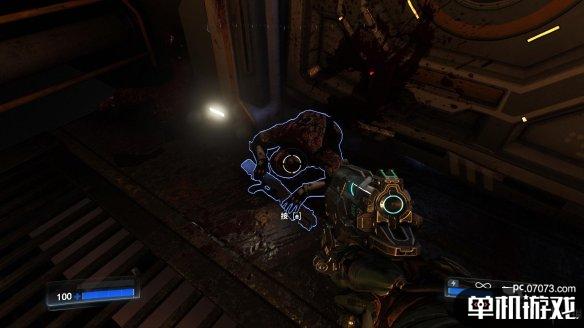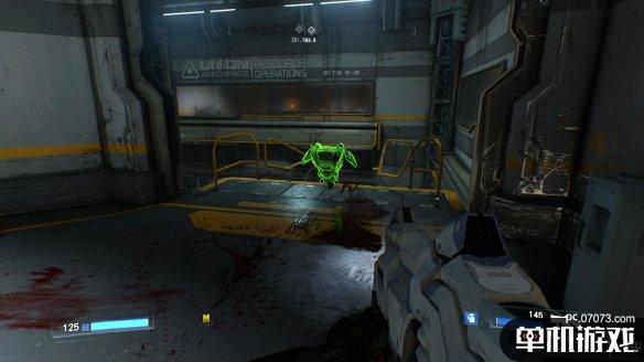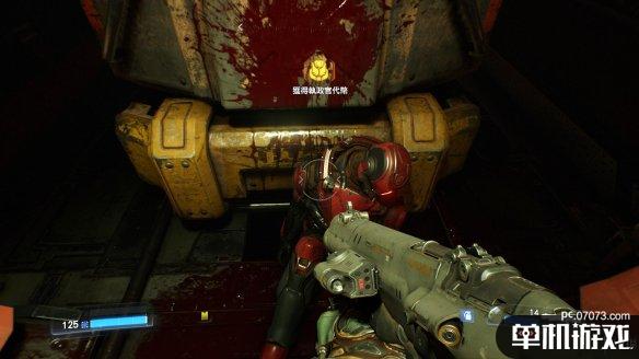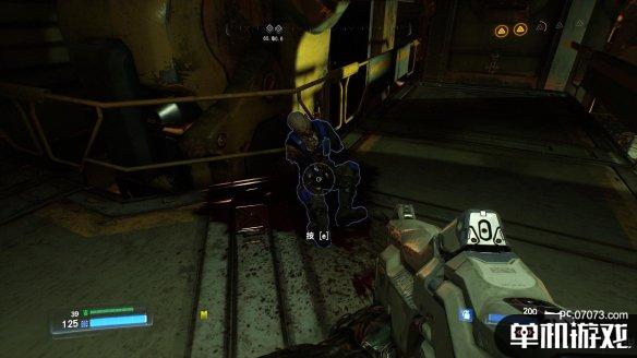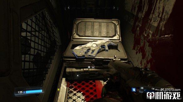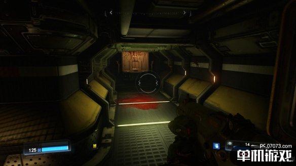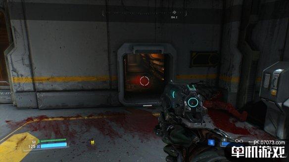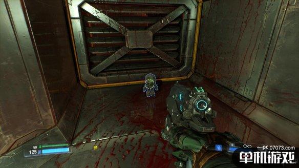 退回来看到里面另一处下方有血的通道,从这里上去。上面可以得到一把电浆步枪。发现秘密6/8.