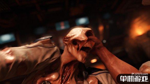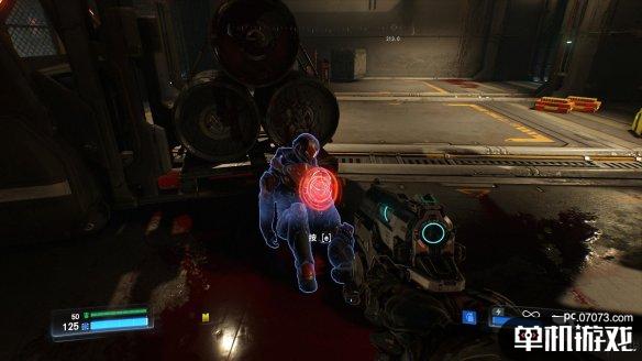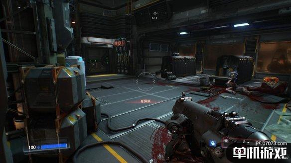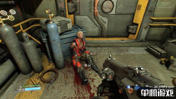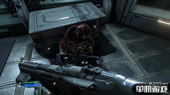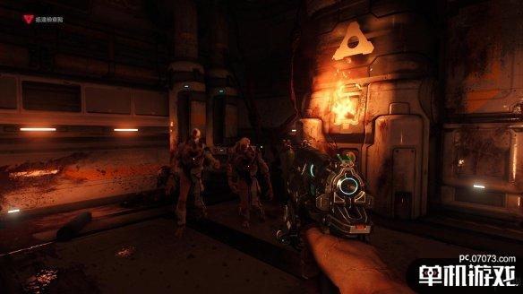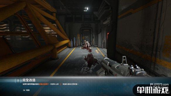 2,走近通道内,里面是数只变异了的设施工作人员,这里是一个练习斩杀的教程。用手枪将怪物打到橘色光芒时靠近点击F,触发斩杀。接着走到尽头,能够看到一个拿着霰弹枪的尸体被压在阀门之下。过去将枪拿过来。