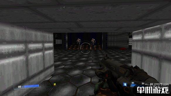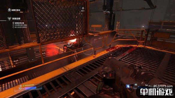 3,从另一个方向的门前行,打开门会看到会自爆的恶灵,我们可以打远边的炸药桶或者提前将其消灭。通道出来是一片较大的区域,这里会要求玩家先把敌人全部消灭。
