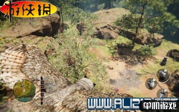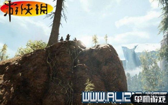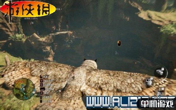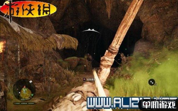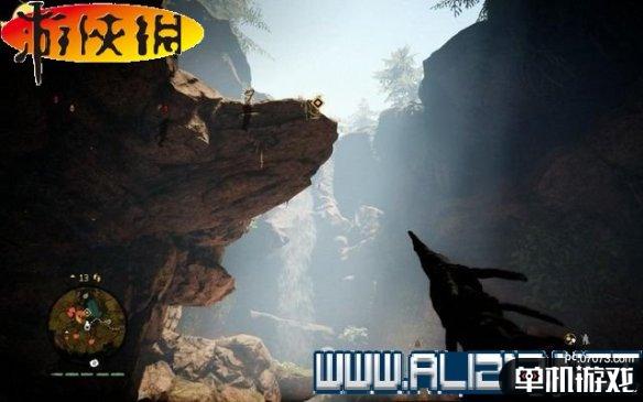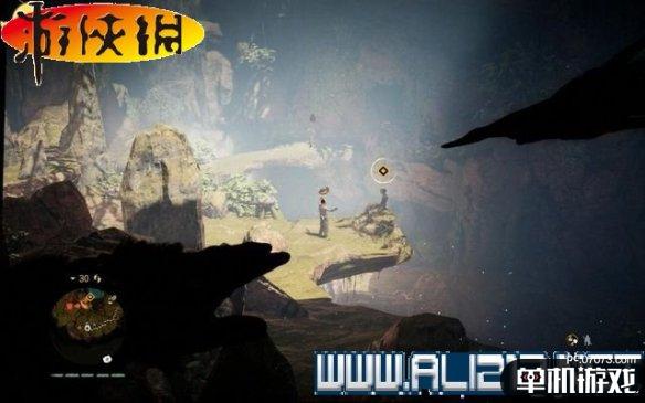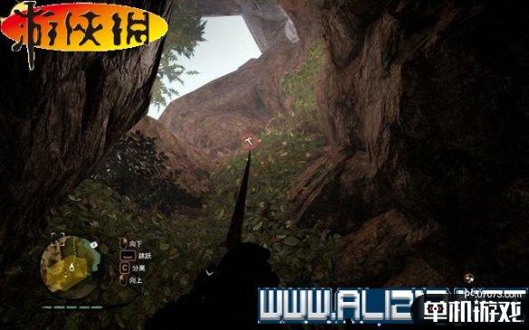 回到洞口,往右边找到一个锚点,用钩爪攀上平台,这样能看到石崖上的三名敌人,其中远处的一个就是要杀的守卫。