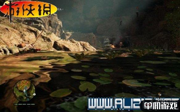 要盗取的面具在左边的二层石崖上,首先跳入水潭,往左岸爬上去,沿斜坡行走。