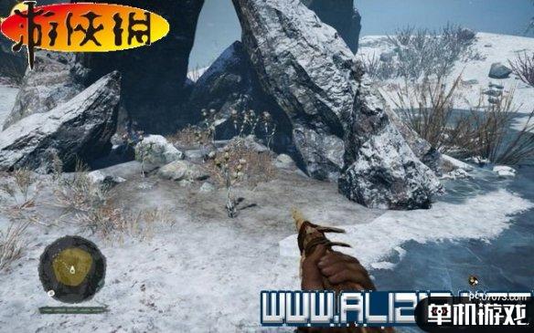 来到北方山巅,寒风呼啸、风雪弥漫。要收集的北黄叶就在如图的几块尖锐石块的中间。