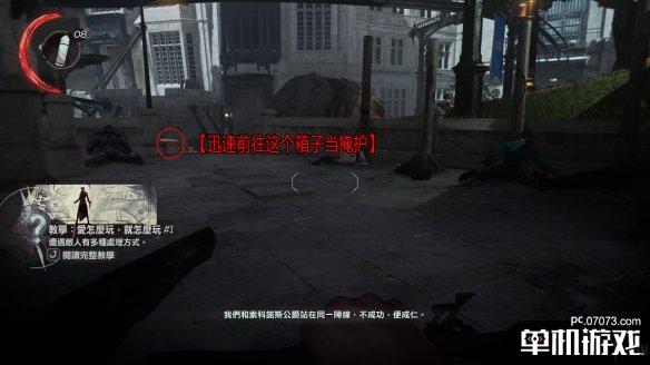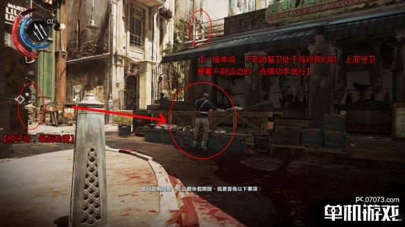 接下来的步骤对时间卡得比较紧。解决屋顶的守卫后,上阳台往下看,可以发现守卫们正在进行对话。趁他们对话时,迅速从左侧跳下,然后潜行来到木箱后。