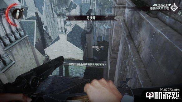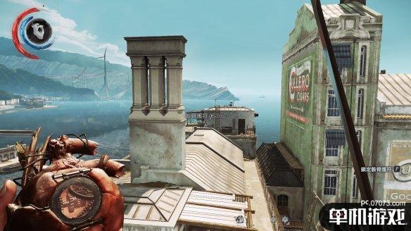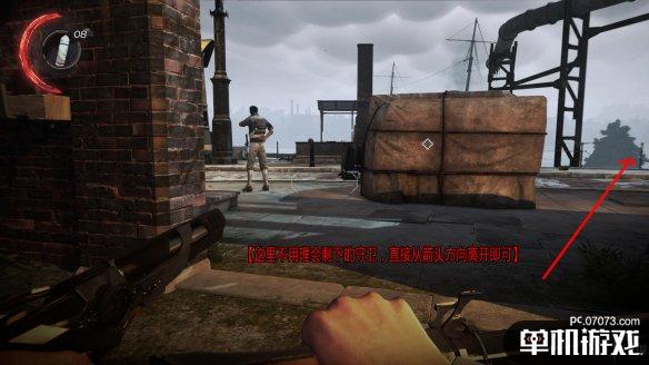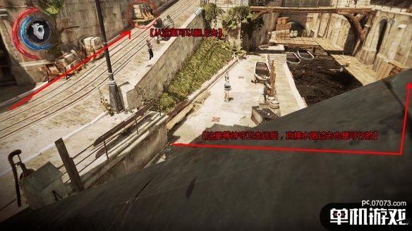 之后我们离轮船就只有一步之遥了。现在这个位置相当安全,也在所有守卫的视线范围之外,也不必去解决面前这个守卫,直接保持潜行从箭头方向离开,之后跳下即可。