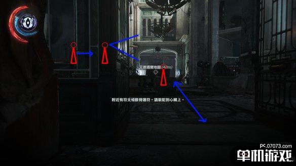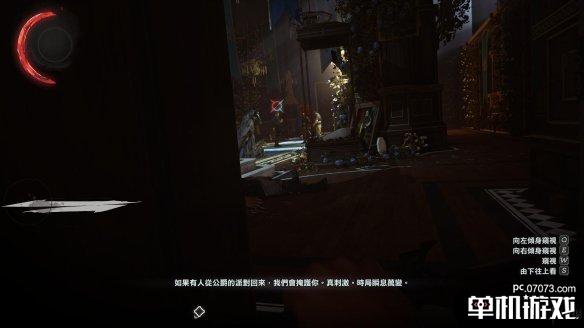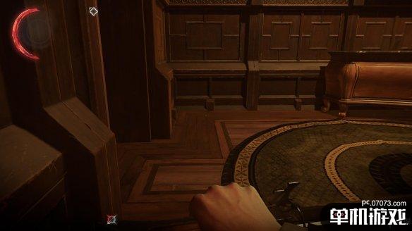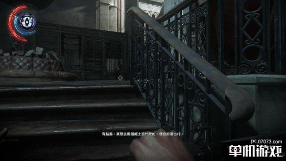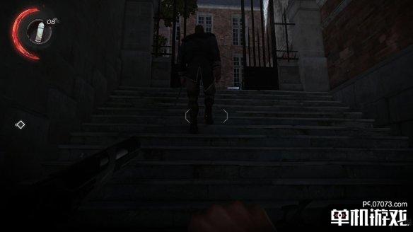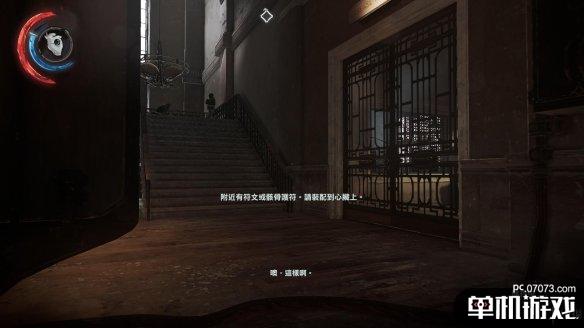 在通往三楼的楼梯上有两个守卫会一直停留在这里。其中一个玩弹珠玩得不亦乐乎...幼稚鬼??通过这组守卫的方法挺多的,可以丢个玻璃吸引守卫注意后,从窗户那边远攀上去,可以暗影形态贴着护栏走上去。一劳永逸的办法就是在楼梯口来回蹭,将站立守卫的注意度吸引到一半,他就会下来查看,趁机将他勒昏,再上去解决另一个。