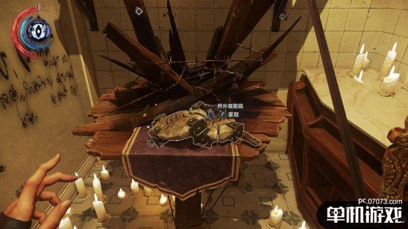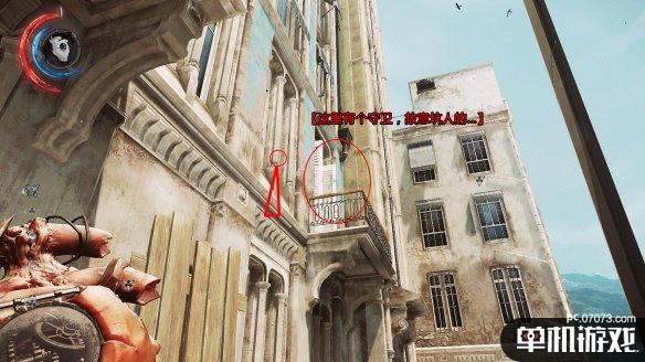 不用急着前进。在这边可以掏出心脏的话,可以感应到附近有符文可以获取。来到此处,可以看到二楼的一个阳台,可以用远攀上去。不过要小心里面就有一个守卫,最好是保持潜行状态,上去后立刻勒昏他。