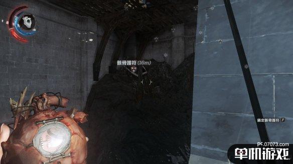 这里掏出心脏,可以看到另一处的楼顶有一个骸骨护符。这边如果去到那边楼顶去拿护符,之后是无法用远攀再回到这个楼顶的,得再从一楼潜入过来,想完成全收集可以把尸体丢在楼顶去拿一次。
